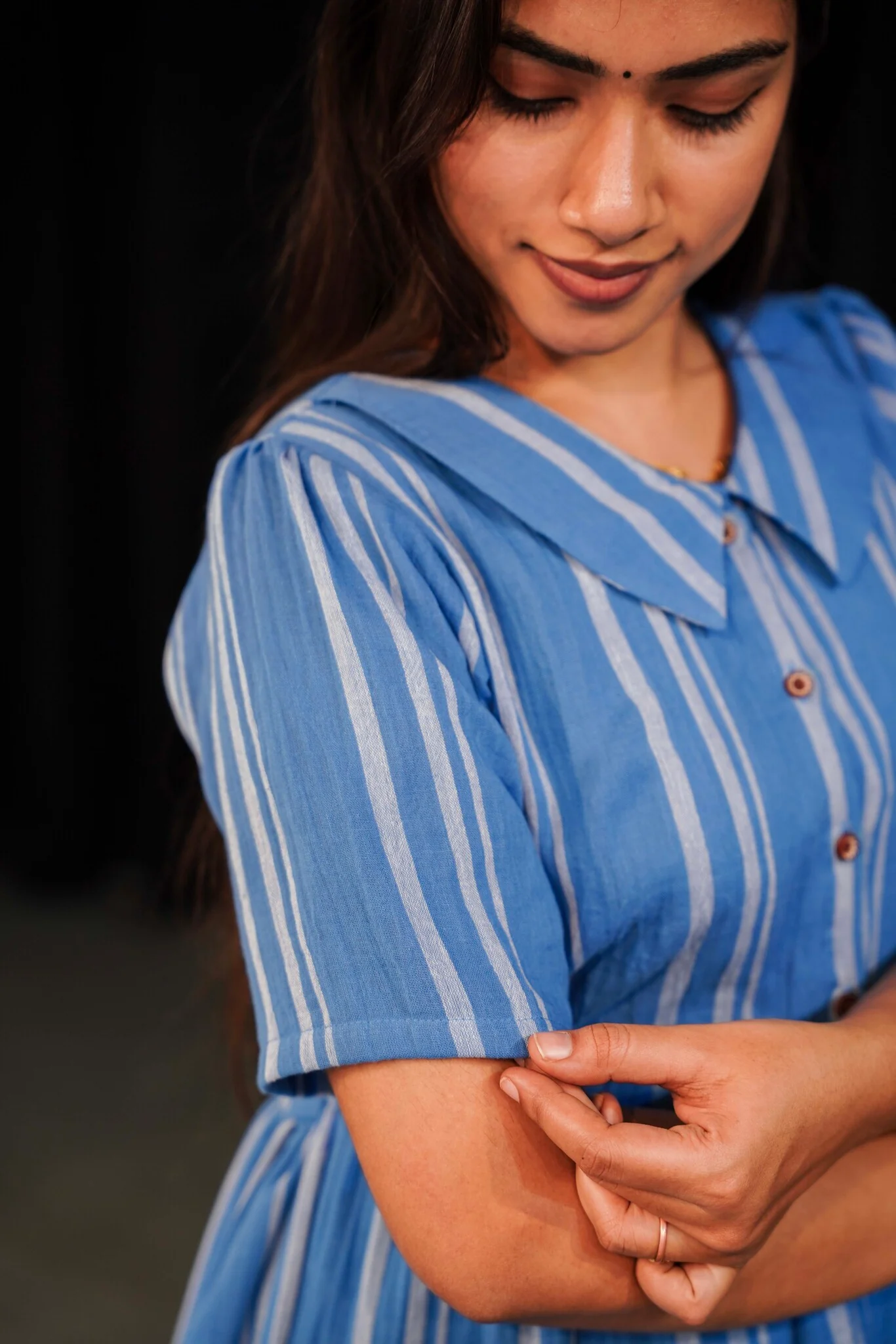 Fresh, breezy, and timeless — Azure Grace is a muslin dress that captures effortless elegance in soft cream and blue stripes. Crafted from 100% pure soft muslin, it’s as breathable and lightweight as it is graceful, making it perfect for festive mornings, brunch dates, or serene evening walks.